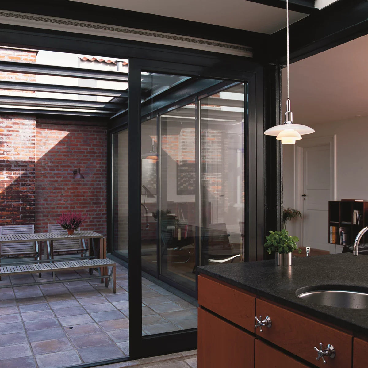 Das charakteristische Dreischirmsystem, das dieser Leuchte zugrunde liegt, wurde mit dem Ziel entwickelt, Licht funktional und gleichzeitig atmosphärisch zu lenken. Das System sorgt dafür, dass direkte Blendung vermieden wird und das Licht gleichmäßig im Raum verteilt wird.
