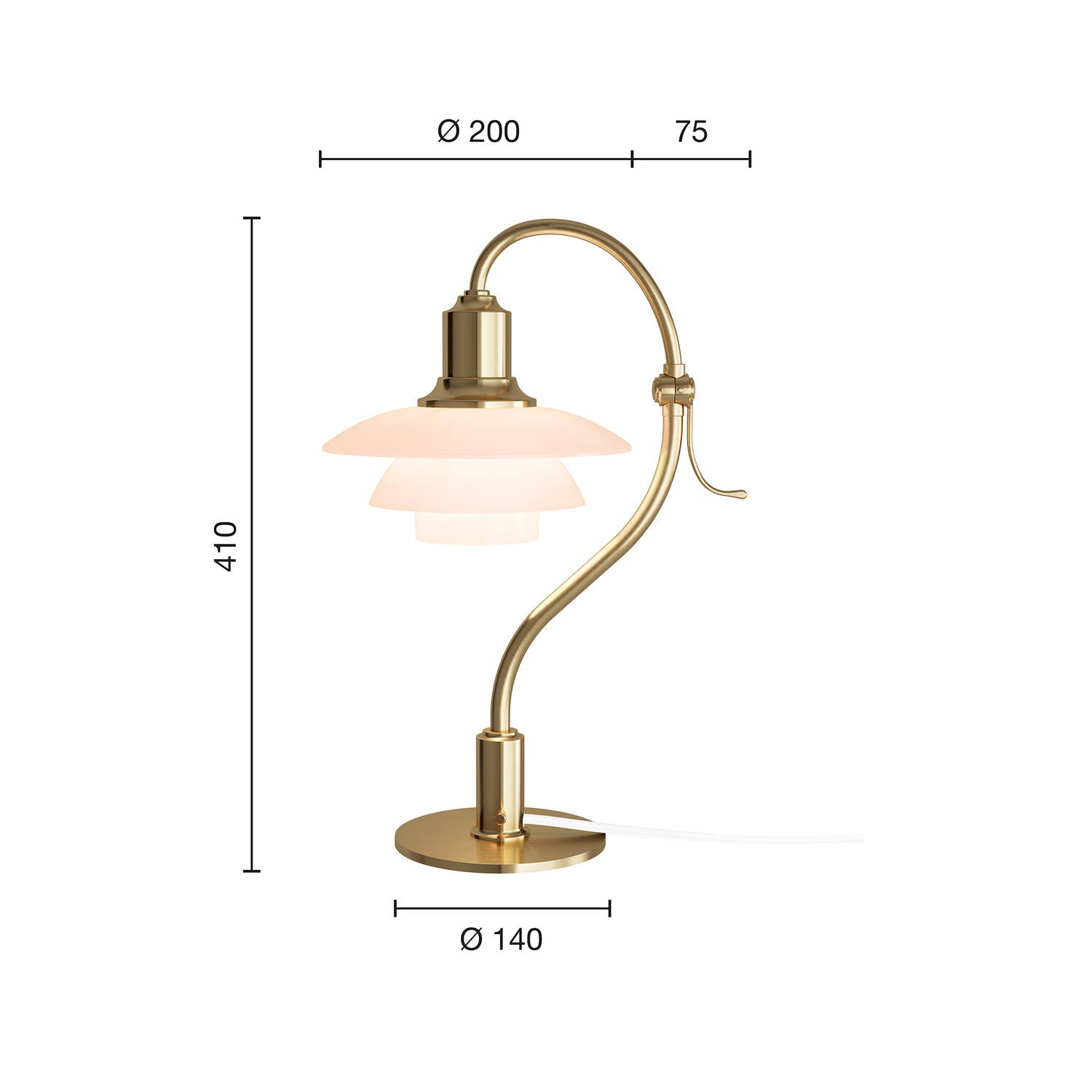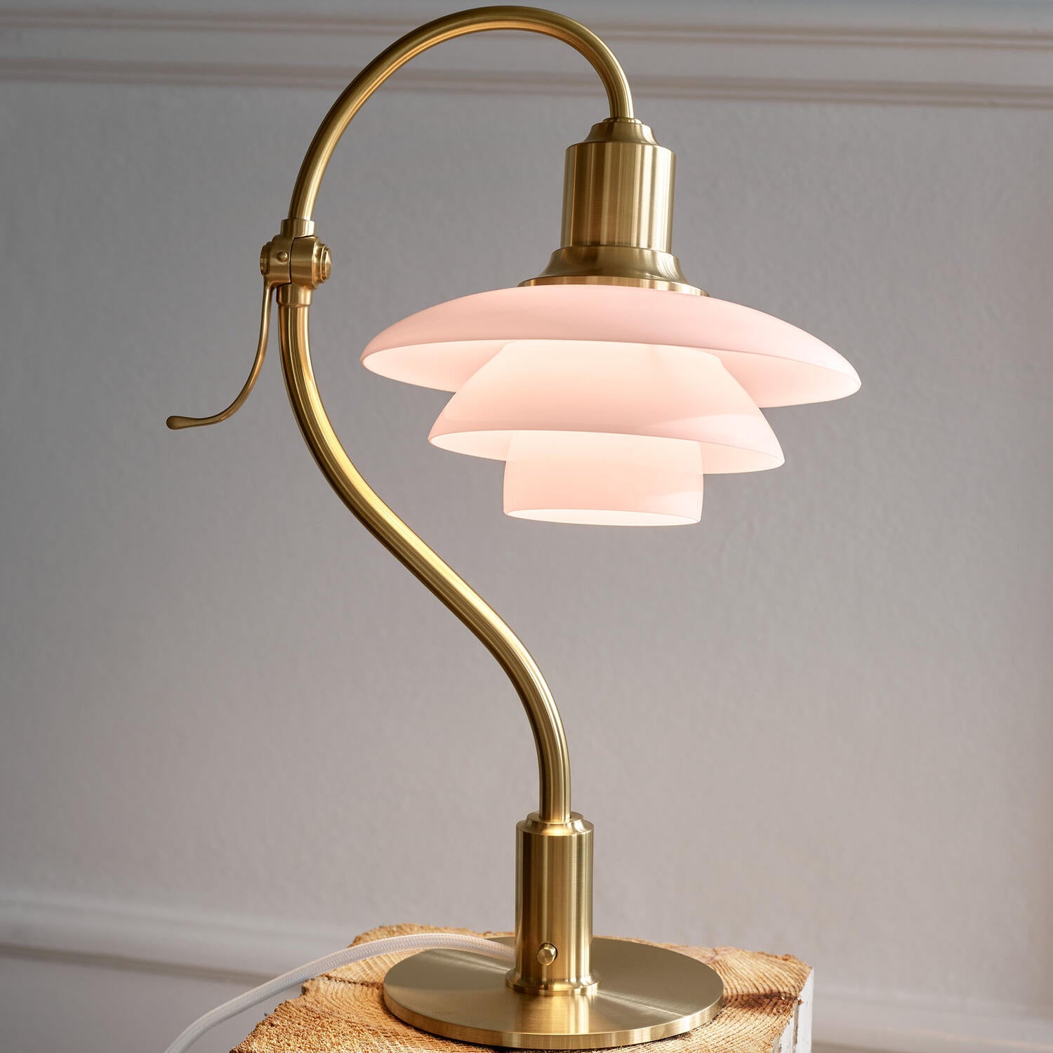Die charakteristische Krümmung des Stiels macht die neue PH 2/2 Question Mark Pale Rose Tischlampe leicht wiedererkennbar. Der Stiel, das Fußstück und das Fassungshäuschen der Tischlampe sind alle aus schönem, gebürstetem Messing mit feinen Linien gefertigt, die der Form der Lampe folgen. Wenn das Messing nicht poliert wird, patiniert es im Laufe der Zeit auf wunderschöne Weise und verleiht der Lampe eine individuelle Note. Es wurde nicht an Details gespart: Der durchgehende Schalter ist diskret und elegant, während der Lampenkopf gedreht werden kann, um die Lampe je nach Verwendung oder Platzierung anzupassen.