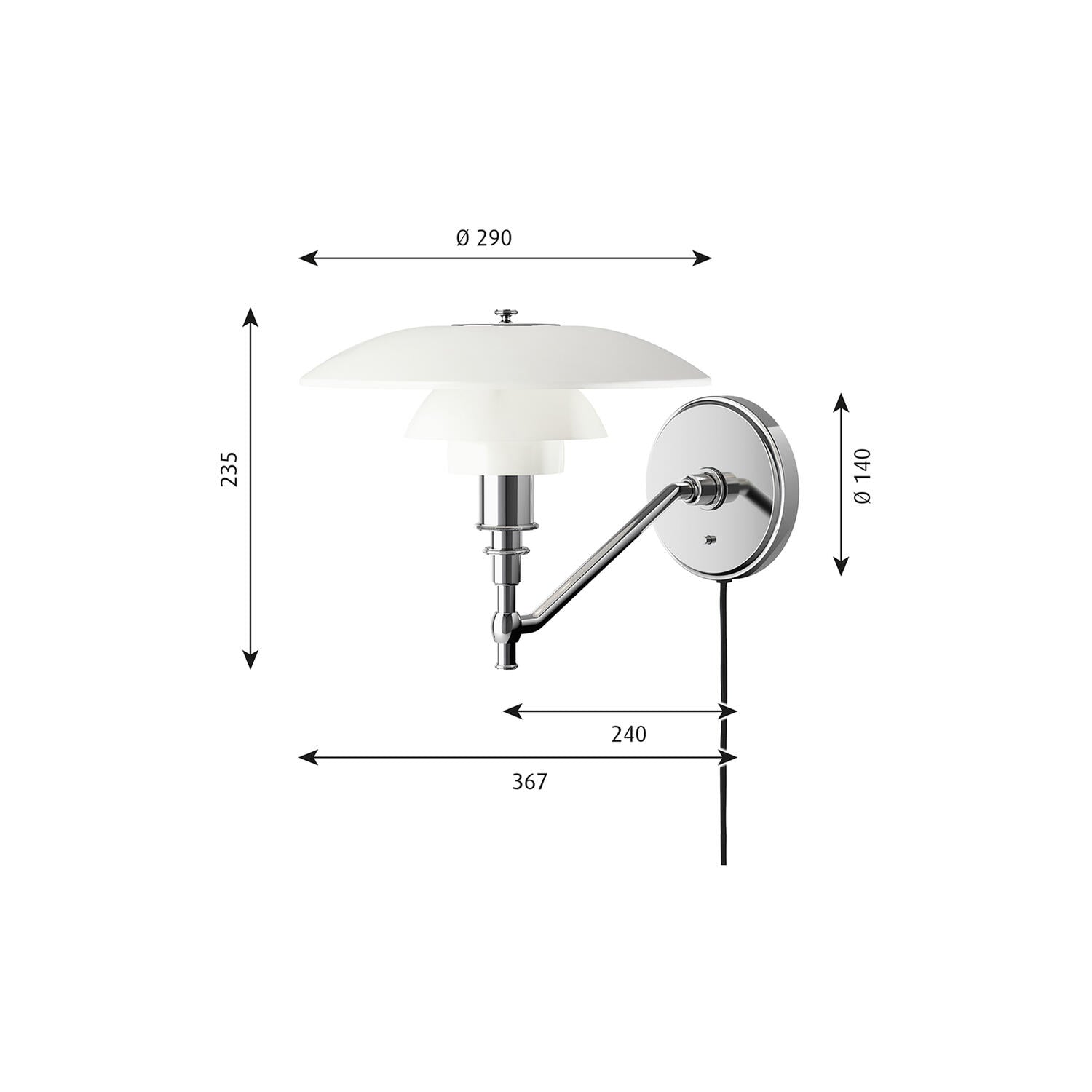 Material: Mundgeblasenes Opalglas mit Wanddose und Arm aus hochglanzverchromtem Messing