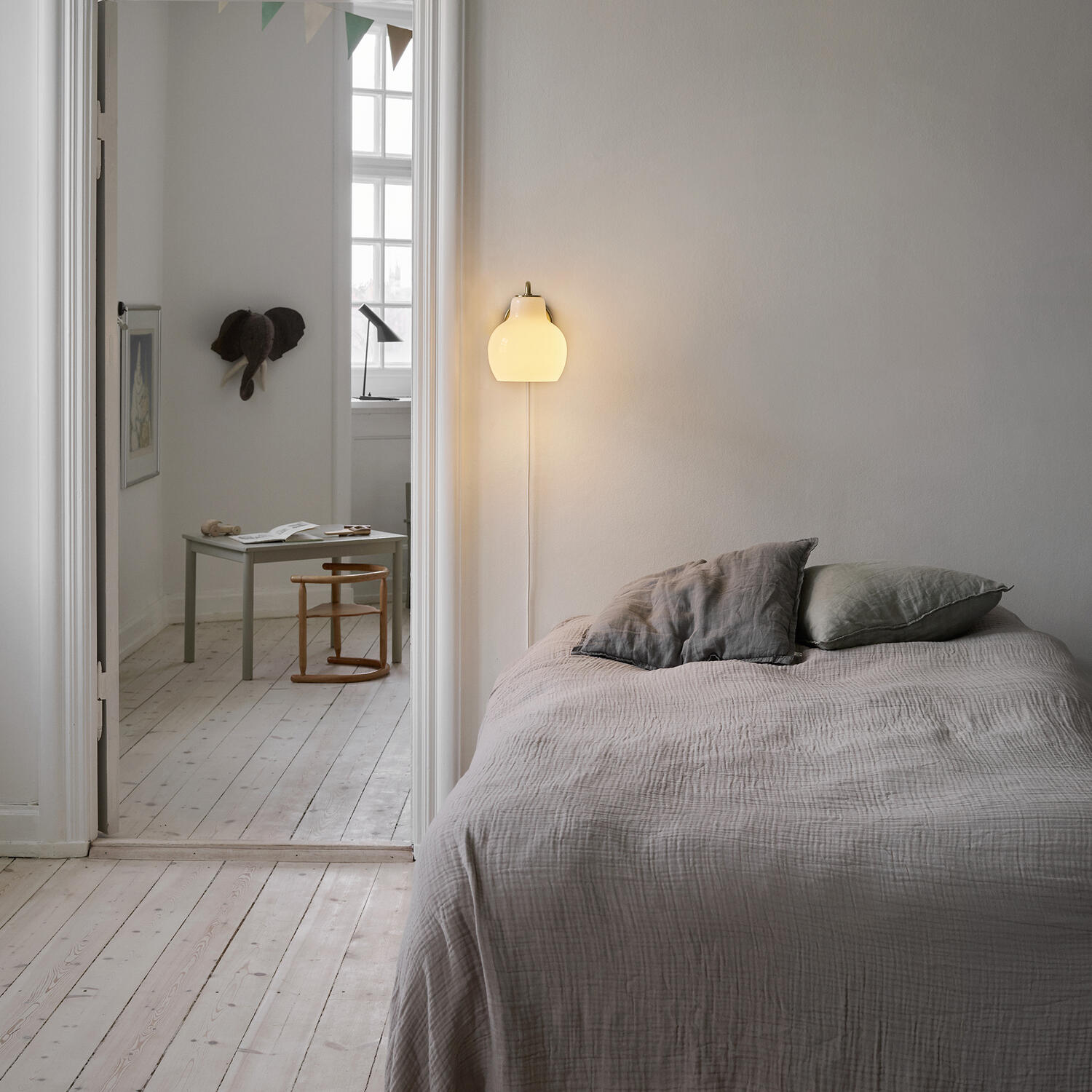 VL Ring Crown 2 Wandleuchte Opal ist eine Wandleuchte des dänischen Architekten Vilhelm Lauritzen. Er entwarf in den 1940er Jahren den stark abgerundeten Lampenschirm, dessen Ästhetik der, sehr ähnlich ist, während die Wahl der Materialien an die erinnert, die schon vorher von Louis Poulsen auf den Markt gebracht wurde. Die mundgeblasenen Schirme sind von höchster Qualität, sodass sie immer einheitlich erscheinen und ein gemütliches, weiches Licht in den Raum werfen.